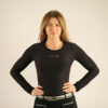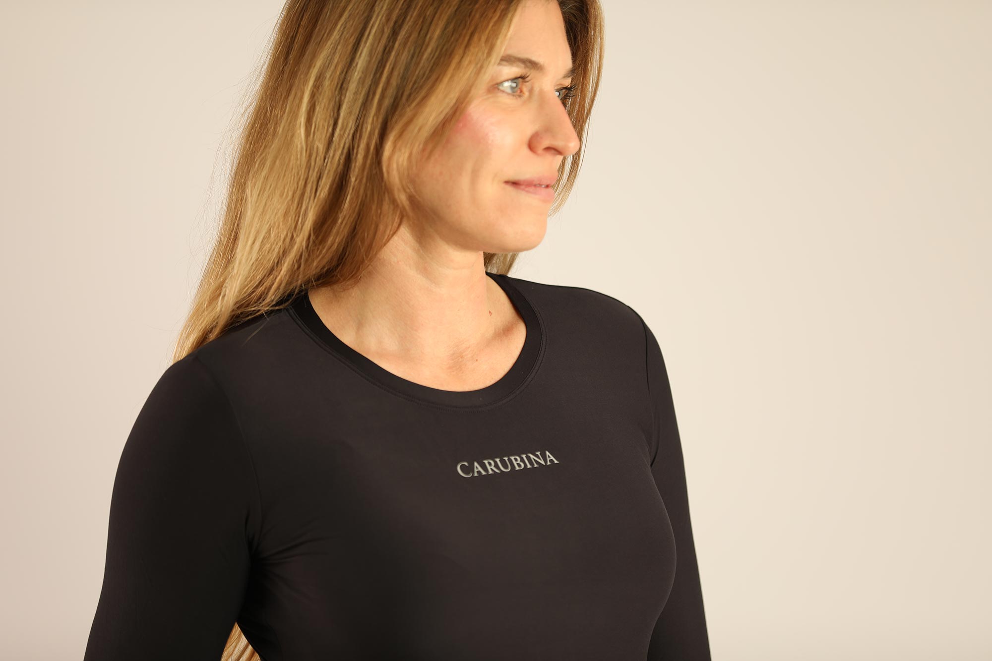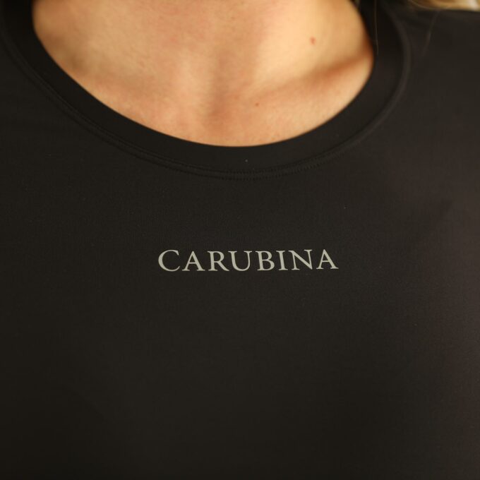 This figure-hugging crew neck functional shirt combines feminine elegance with maximum comfort. The figure-hugging cut flatters the silhouette and ensures a special fit. The casual CARUBINA lettering on the chest and along the spine make this piece an absolute eye-catcher in the saddle as well as in everyday life. Made from nylon and spandex, the long-sleeved shirt offers optimal freedom of movement and a soft feel against the skin, even on long days. This versatile favorite impresses with its comfortable quality, stylish simplicity, and perfect fit like a second skin.