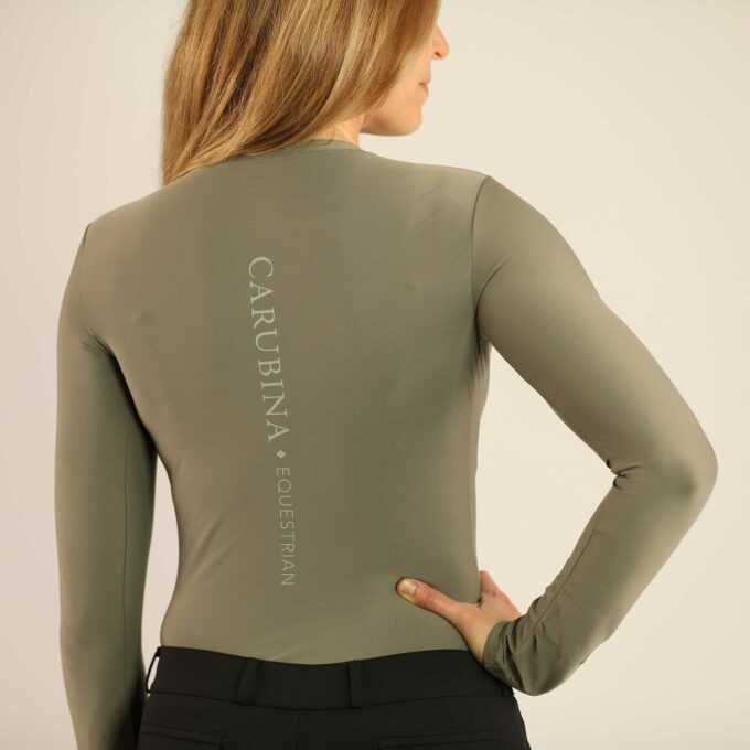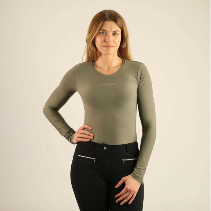 This figure-hugging crew neck functional shirt combines feminine elegance with maximum comfort. The figure-hugging cut flatters the silhouette and ensures a special fit. The casual CARUBINA lettering on the chest and along the spine make this piece an absolute eye-catcher in the saddle as well as in everyday life. Made from nylon and spandex, the long-sleeved shirt offers optimal freedom of movement and a soft feel against the skin, even on long days. This versatile favorite impresses with its comfortable quality, stylish simplicity, and perfect fit like a second skin.