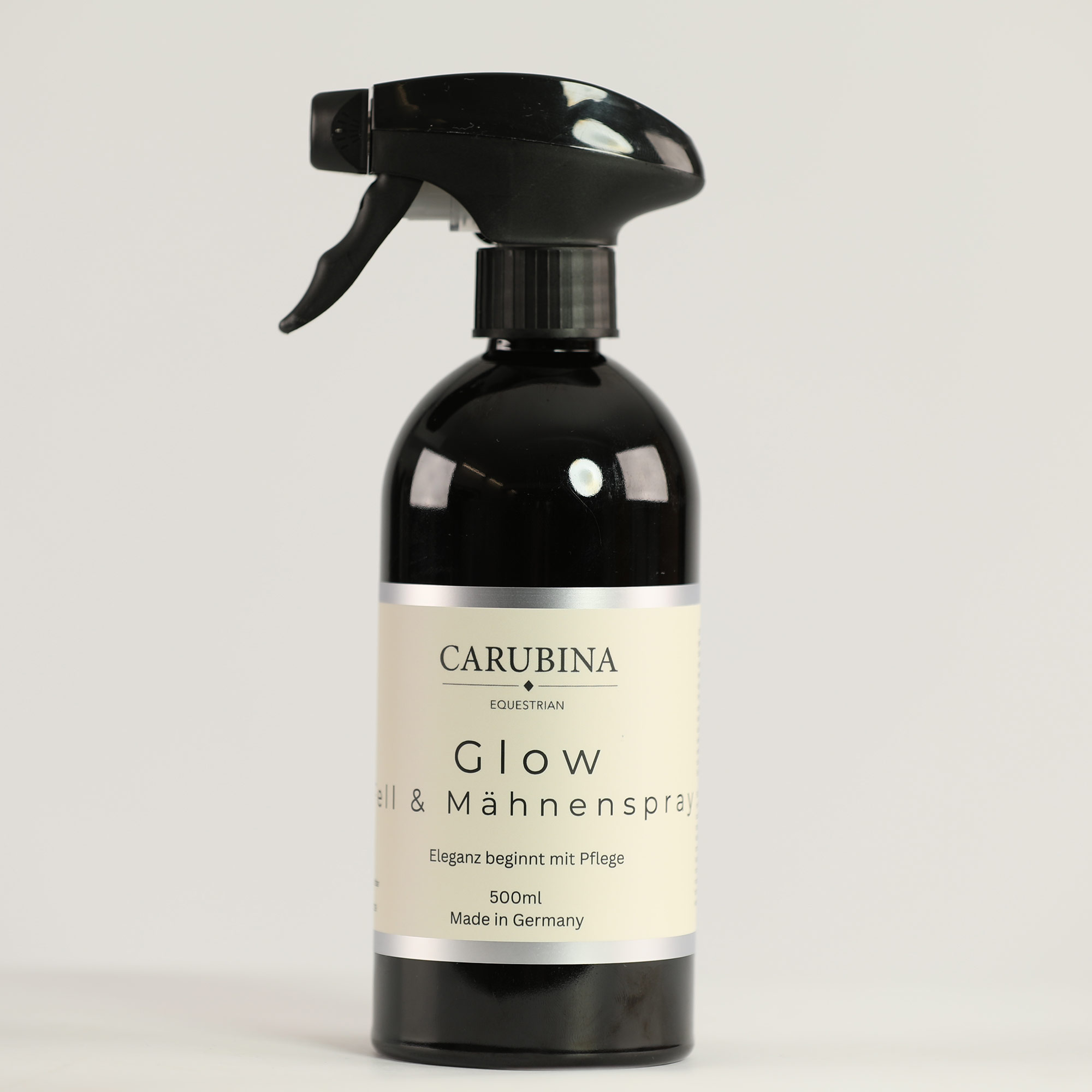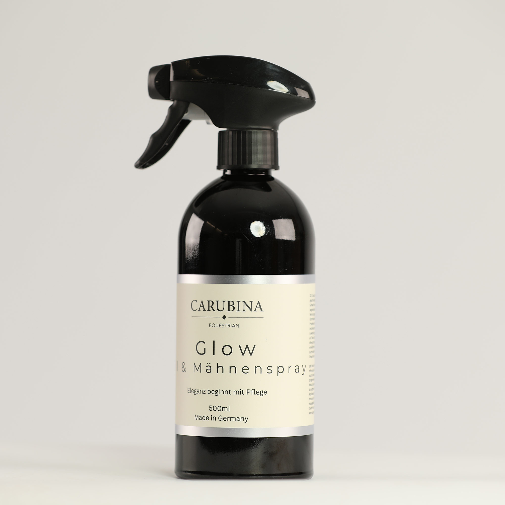 CARUBINA Glow Coat & Mane Spray provides an exceptionally long-lasting, silky shine and gives the mane, tail, and coat visibly more volume—without weighing them down.