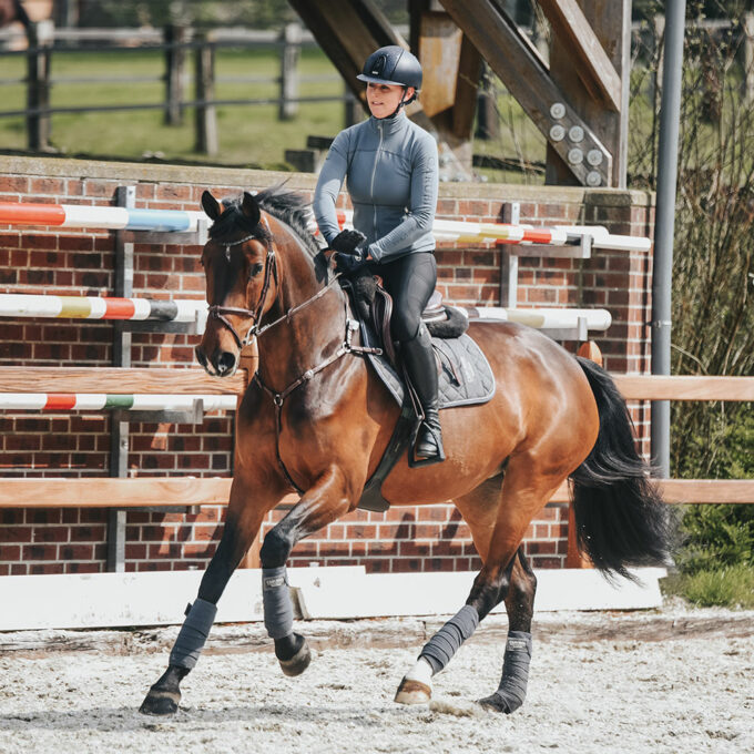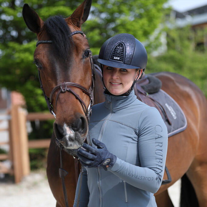 The grey two-way YKK zipper and antracite logo prints on the lower and upper arm make it an absolute eye-catcher whether during training on the horse, on the treadmill in the gym or during the morning jogging in the woods. The perfect fit, the soft and at the same time breathable material, makes this favourite part to an absolute must-have for every sport enthusiastic rider!
