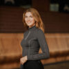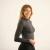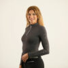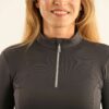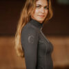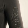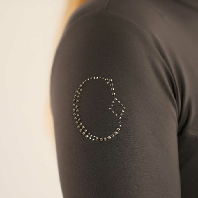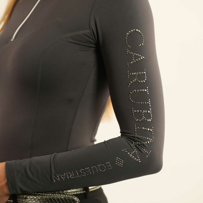 Slim fit long sleeve made of the latest high-tech sports material. The silver YKK zipper and glitter logo prints made from small mini studs on the lower and upper arm make it an absolute eye-catcher whether during training on the horse, on the treadmill in the gym or during the morning jogging in the woods.The perfect fit, the soft and at the same time breathable material, makes this favorite part to an absolute must-have for every sport enthusiastic rider!