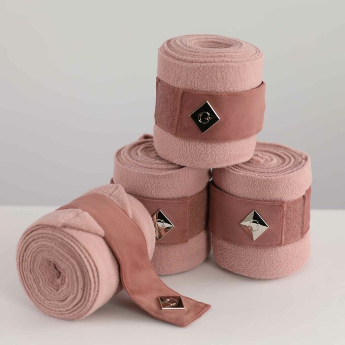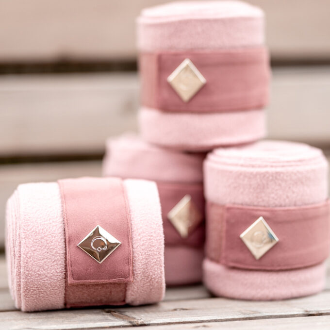 The polo bandages CAVALENTIN impress with high-quality, breathable, anti-pilling fleece material, as well as elegant metal logo and velvet details (matching the CAVELLY saddle pad). The bandages are fastened with a sturdy velcro closure and are very soft and shape-retaining. They are delivered as a set of four in a mesh bag, which can also be used as a laundry pouch.