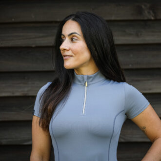 Gefertigt in Europa, aus dem besten Funktionsmaterial aus Italien in perfekter Passform, in Kombination mit dem schönen grauen Logoprint auf dem Rücken und dem YKK Schmuckzipper begeistert dieses Shirt bereits tausende Reiterinnen.