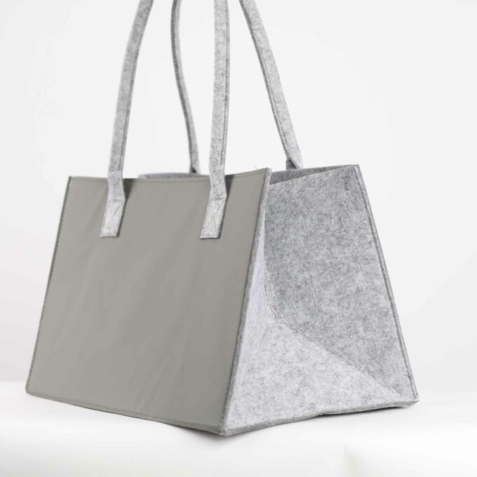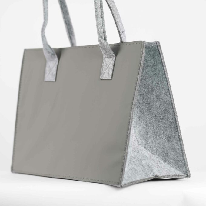 Die Tasche besteht aus robustem Filz, der nicht nur leicht, sondern auch stabil ist. Die Rückseite ist mit Kunstleder verstärkt, was die Tasche besonders widerstandsfähig macht und den Tragekomfort erhöht.