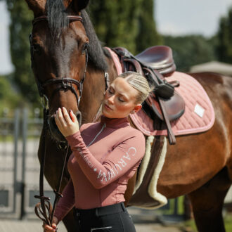 Figurbetontes Funktionskurzarmshirt gefertigt aus dem neusten high-tech Sportmaterial. Das Material schmiegt sich durch den 2-Wegestretch wie eine zweite Haut an den Körper und trocknet nach dem Sport blitzschnell! Die silbernen Logoprints und der chice V-Neck Ausschnitt in Kombination mit dem Stehkragen machen das Teil zu einem sportlich-eleganten Eyecatcher. Ob beim Training auf dem Pferd, auf dem Laufband im Fitnessstudio, beim Yoga oder der morgendlichen Joggingrunde im Wald. Die perfekte Passform und das weiche sowie gleichzeitig atmungsaktive Material mit UV-Schutz runden dieses Lieblingsteil zu einem absoluten Must-have für jede sportbegeisterte Reiterin ab!