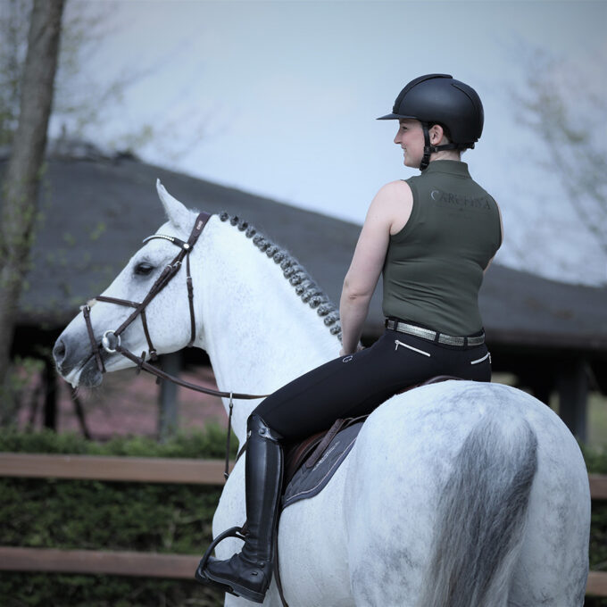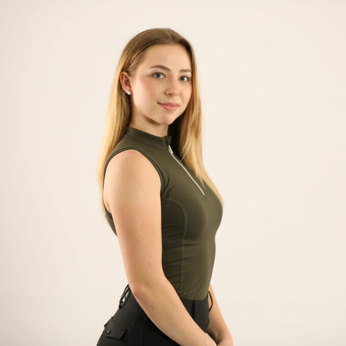 Figurbetontes Funktionsshirt ohne Ärmel aus dem neusten high-tech Sportmaterial! Der silberne YKK-Zipper und anthrazit Logoprint am Rückenteil machen das Teil zu einem absoluten Eyecatcher, ob beim Training auf dem Pferd, auf dem Laufband im Fitnesstudio oder bei der morgendlichen Joggingrunde im Wald. Die perfekte Passform, das weiche und gleichzeitig atmungsaktive Material mit UV-Schutz runden dieses Lieblingsteil zu einem absoluten Must-have für jede sportbegeisterte Reiterin ab!