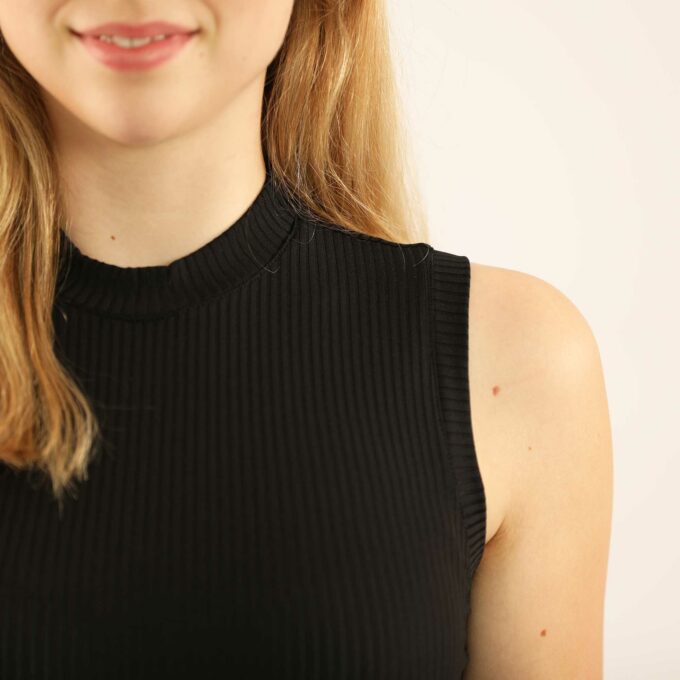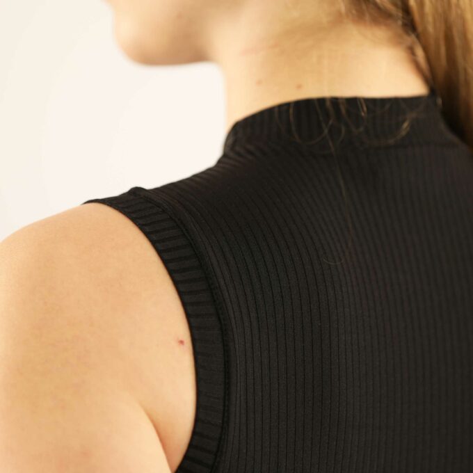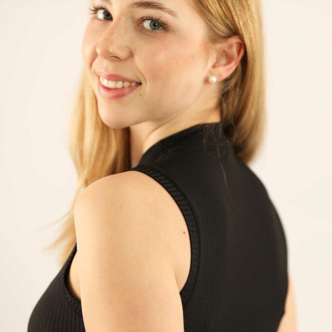 Figurbetontes, ärmelloses Funktionsshirt gefertigt aus einem leichten, hightech Rippe-Sportmaterial. Das Material schmiegt sich durch den 2-Wegestretch wie eine zweite Haut an den Körper und trocknet nach dem Sport blitzschnell! Der leichte Glanz des Materials und der dezente Stehkragen machen das Teil zu einem sportlich-eleganten Eyecatcher. Ob beim Training auf dem Pferd, auf dem Laufband im Fitnessstudio, beim Yoga oder der morgendlichen Joggingrunde im Wald. Die perfekte Passform und das weiche sowie gleichzeitig atmungsaktive Material mit UV-Schutz runden dieses Lieblingsteil zu einem absoluten Must-have für jede sportbegeisterte Reiterin ab!