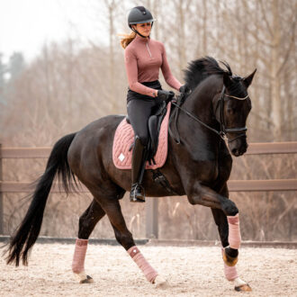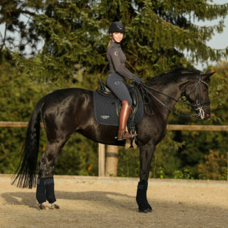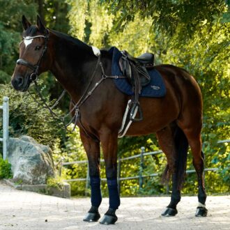 Unsere Schabracke CAVELLY aus hochwertigem Samt bietet ein schockabsorbierendes und formstabiles Polster und maximale Luftzirkulation durch das atmungsaktive Cool-Dry-Mesh Futter.