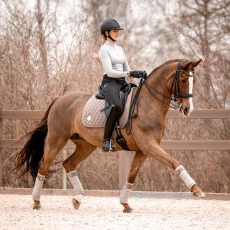 Unsere Schabracke CAVELLY aus hochwertigem Samt bietet ein schockabsorbierendes und formstabiles Polster und maximale Luftzirkulation durch das atmungsaktive Cool-Dry-Mesh Futter.